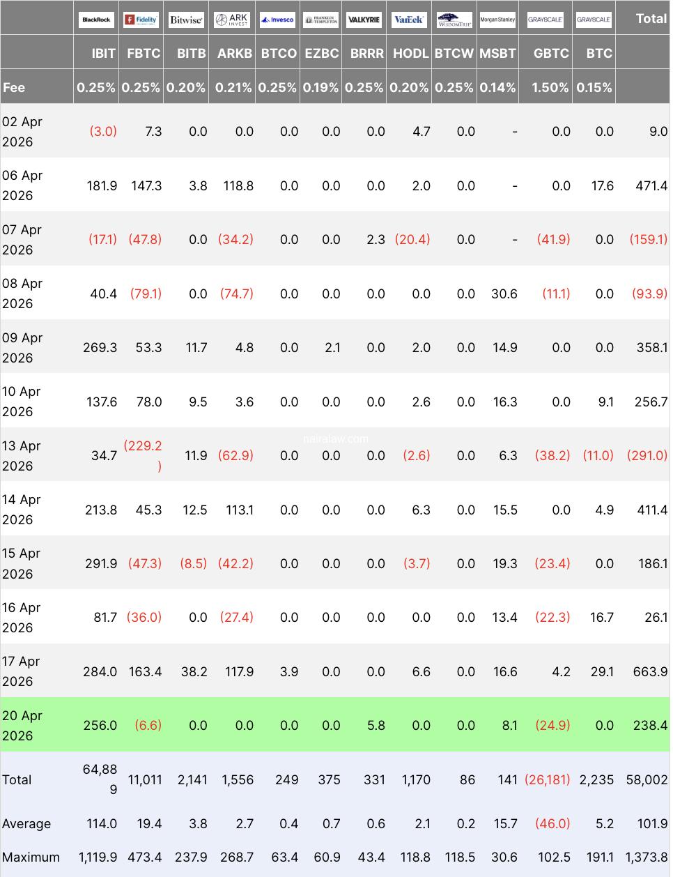 U.S. spot bitcoin ETFs collectively booked $1.9 billion in net inflows across the same five-day stretch, the strongest weekly haul since early February. The marquee single-session was April 17, when total ETF flows hit $663.89 million, with IBIT alone pulling in $283.96 million and Fidelity’s FBTC adding another $163 million.