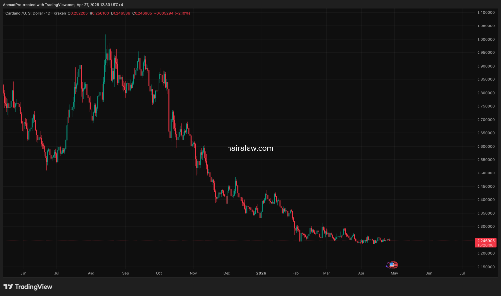 Cardano price is pressing against a wall, with the ADA price trading between $0.24 and $0.25 as of April 27, with price coiling beneath a descending trendline resistance near $0.28, a level that could define the next significant directional move for the asset.