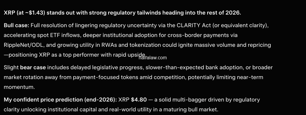 Grok projection would reasonably place XRP in the $3.80 to $5.20 range by December 2026, implying a 2.6x to 3.6x move, driven by potential legislative clarity around digital assets, renewed institutional flows through RippleNet and ODL corridors, and expanding relevance in tokenization and cross-border settlement.